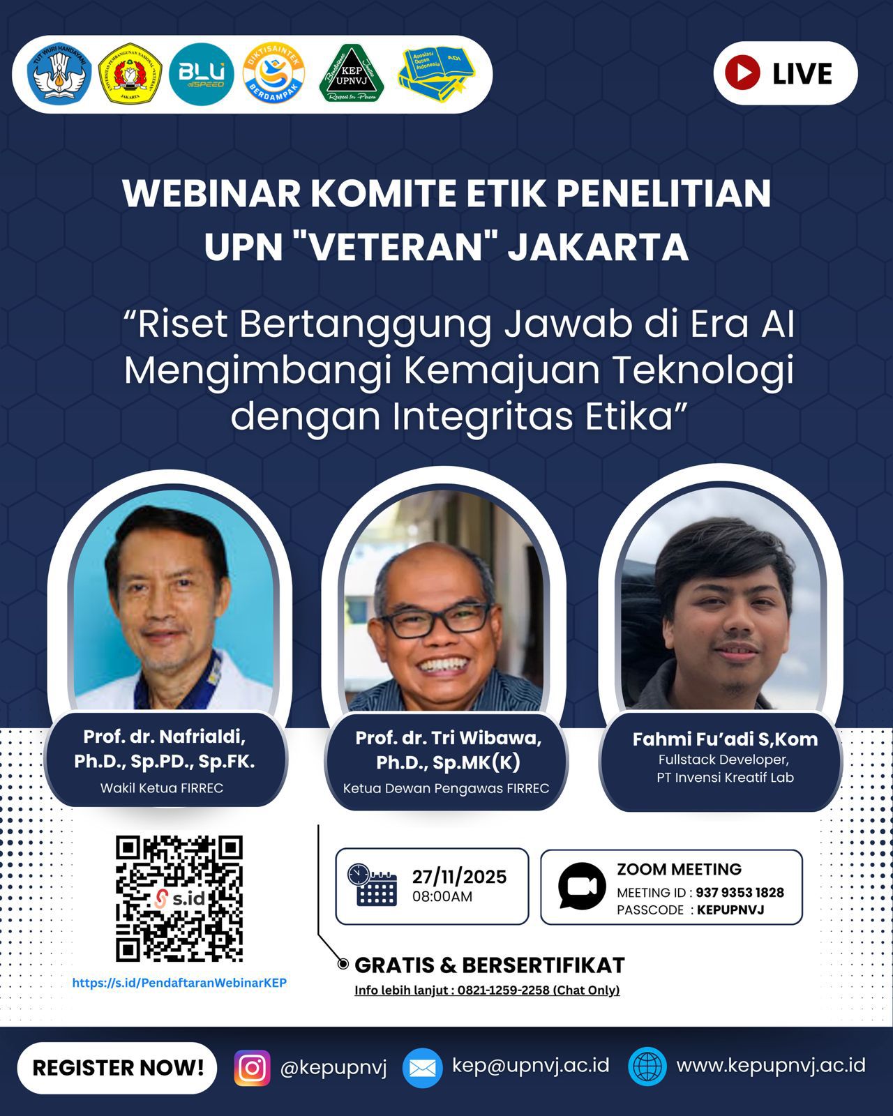 KEPUPNVJ Lembaga Penelitian dan Pengabdian kepada Masyarakat (LPPM) berkolaborasi dengan Komite Etik Penelitian (KEP) Universitas Pembangunan Nasional “Veteran” Jakarta UPNVJ menyelenggarakan webinar bertema "Research Ethics In Practices: Challenges In Developing Countries" pada Selasa, 15 Juli 2025 secara daring melalui Zoom Meeting.